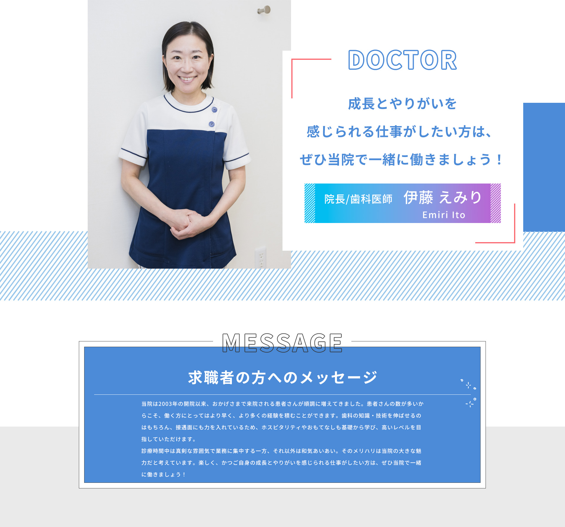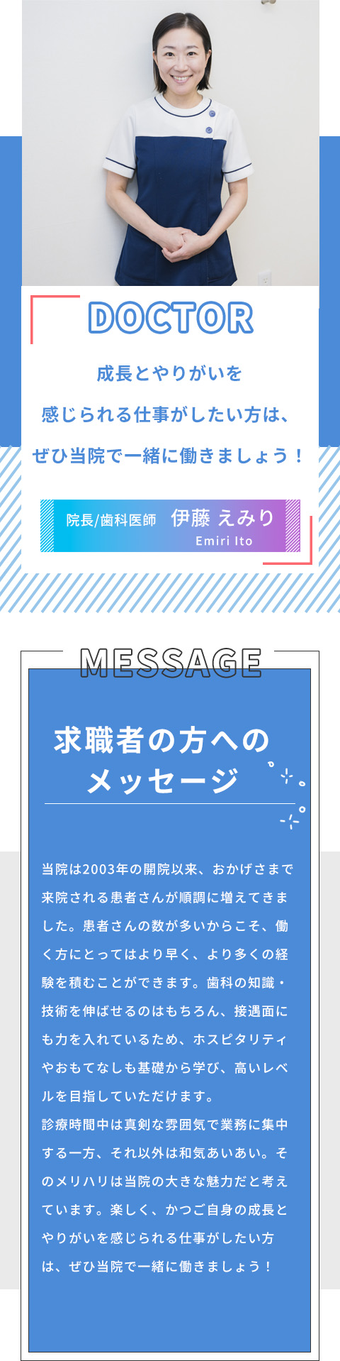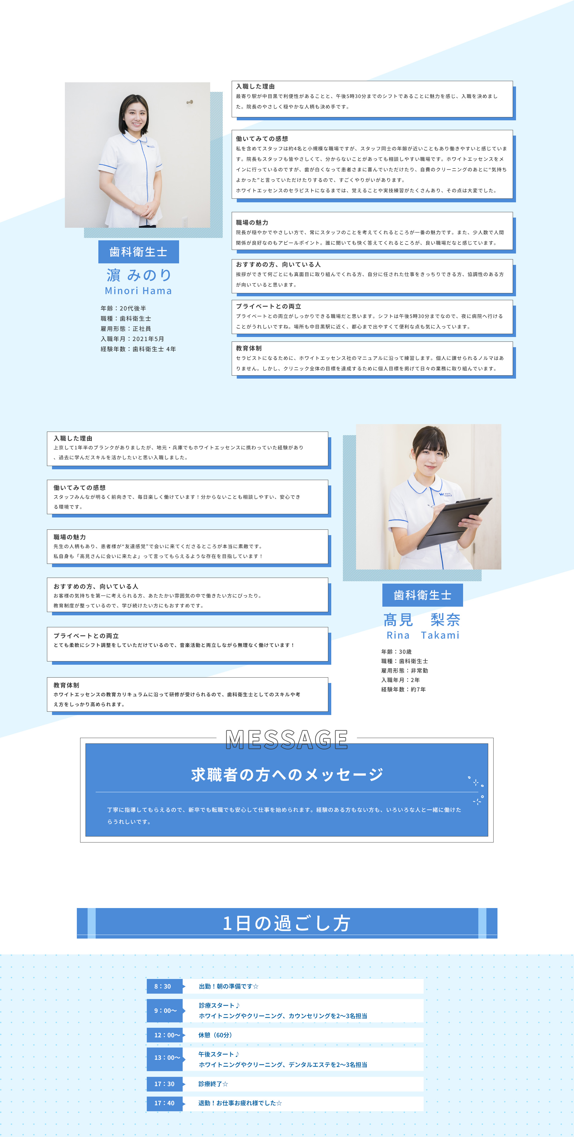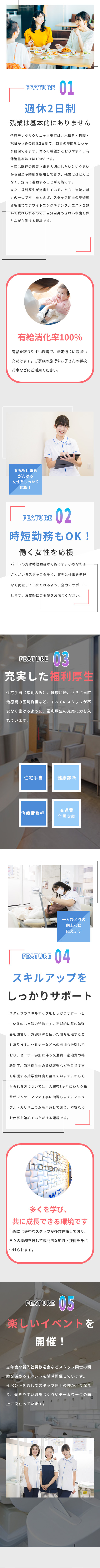 | ◆福利厚生 | 雇用保険、労災保険、厚生年金、社会保険完備 制服貸与 セミナー参加補助 資格取得支援 健康診断 デンタルエステ受け放題 治療割引 |