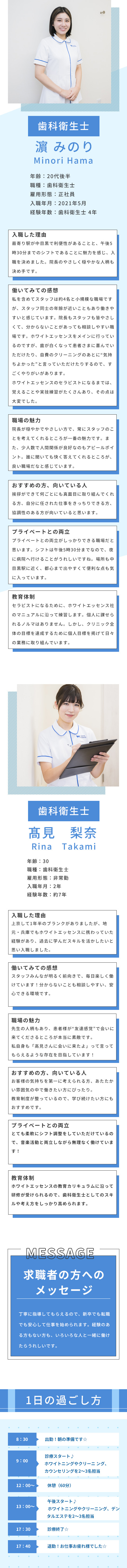 | ◆雇用形態 | ◆正社員 【業務内容】 ●一般歯科業務 スケーリング、SRP、PMTC、TBI ●ホワイトエッセンス業務 ホワイトニング、自費クリーニング、リップエステなど、 デンタルエステ・予防メニューを施術いただきます |
